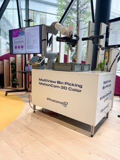 In cooperation with T-Mobile and our partner Photoneo (now part of Zebra Technologies), we presented a specific machine vision application on-site: the MultiView Bin Picking MotionCam-3D Color solution.  This demonstration showed robotic picking of objects from bins using 3D data. The system uses advanced scene scanning and image processing to reliably recognize individual objects, even when they are randomly arranged or overlapping.